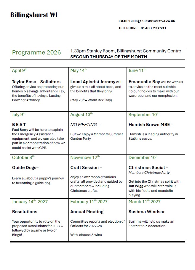 The picture opposite shows members of the Billingshurst WI attending the recent Billingshurst Showcase Event. The programme of events coming up for 2026 can be found HERE
