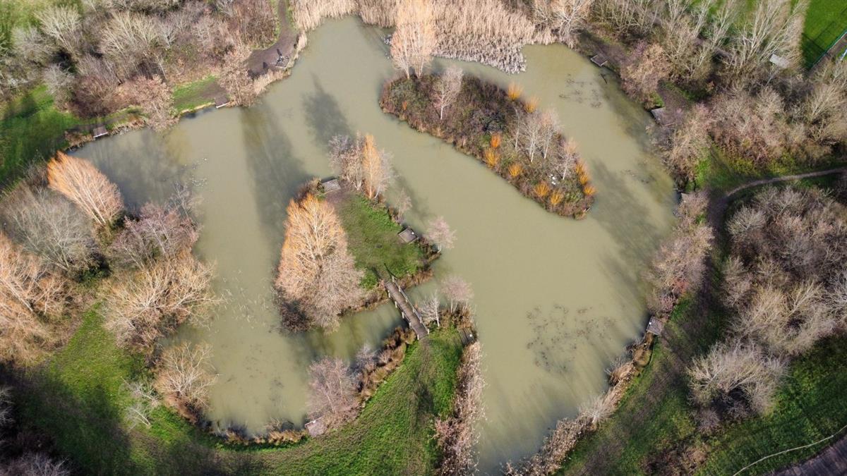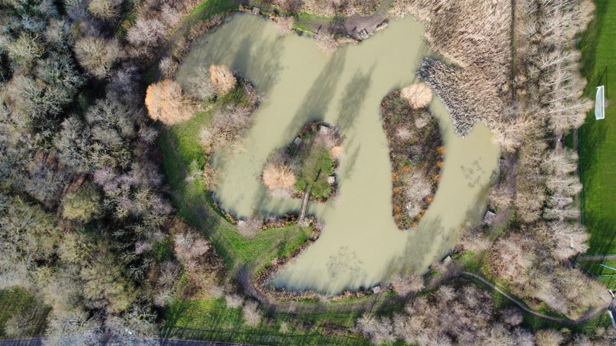 It involved the removal and shaping of some 8000 cubic meters of soil. The lake is fed by natural water flow from the ditch system draining the Jubilee Fields complex. There are 15 fishing platforms which surround a remote island, encouraging wildlife to colonise the area.
